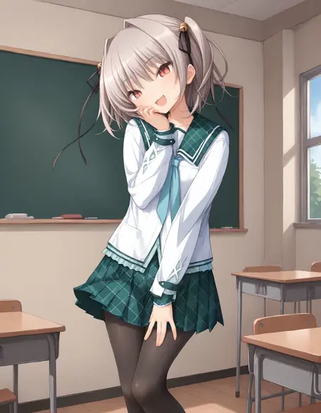 outfit01, green sailor collar, plaid sailor collar, shirt, white shirt, long sleeves, split sleeves, green cuff, plaid cuff, undershirt, light green undershirt, tie, light green tie, skirt, green skirt, plaid skirt, pleated skirt, pantyhose, black pantyhose, hairbow, black hairbow, bells on hairbow, yellow bells on hairbow,