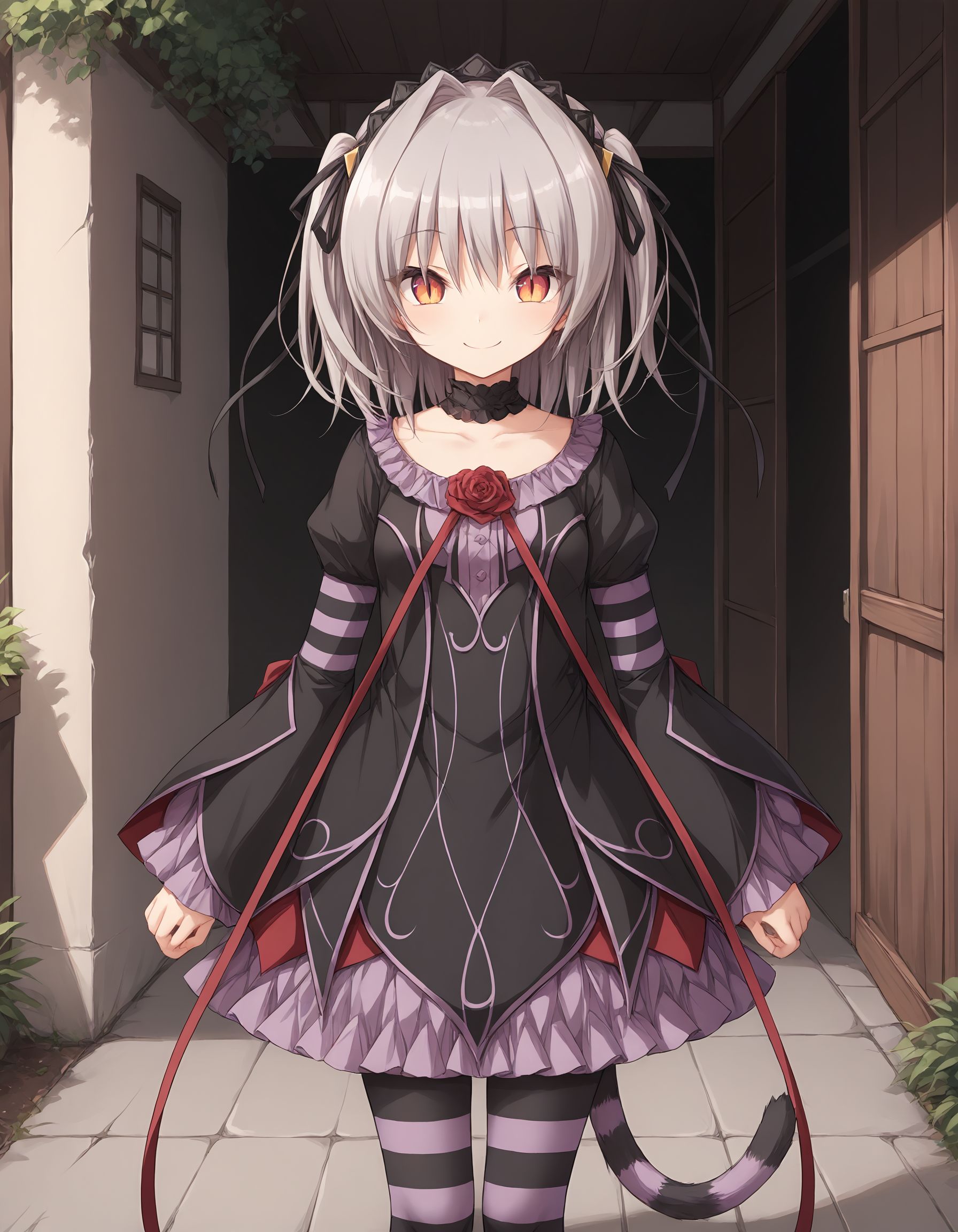outfit03, hairbow, black hairbow, brim, black brim, dress, black dress, gothic dress, frilled dress, rose on dress, ribbon, red ribbon, ribbon extending from dress, long sleeves, puffy sleeves, wide sleeves, striped sleeves, cuffs, frill cuffs, thighighs, striped thighhighs, purple thighhighs, tail, purple tail, cat tail, striped tail,