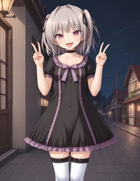 outfit02, choker, black choker, dress, one-piece dress, short dress, black dress, frills, purple frills, frills decollated dress, short sleeves, puffy short sleeves, ribbon, purple ribbon, white thighhighs, black frill trimmed thighhighs, zettai ryouiki, hairbow, black hairbow, bells on hairbow, yellow bells on hairbow,