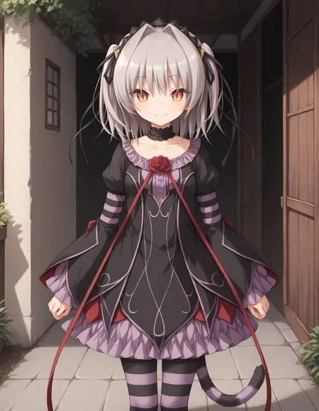 outfit03, 헤어 리본, 검정 헤어 리본, 모자 끝, 검정 모자 끝, 드레스, 검정 드레스, 고딕 드레스, 프릴이 달린 드레스, 드레스에 장식된 장미, 리본, 빨간 리본, 드레스에서 뻗어 나온 리본, 긴 소매, 부풀어 오른 소매, 넓은 소매, 줄무늬 소매, 팔목, 프릴이 달린 팔목, 허벅지 스타킹, 줄무늬 허벅지 스타킹, 보라색 허벅지 스타킹, 꼬리, 보라색 꼬리, 고양이 꼬리, 줄무늬 꼬리,