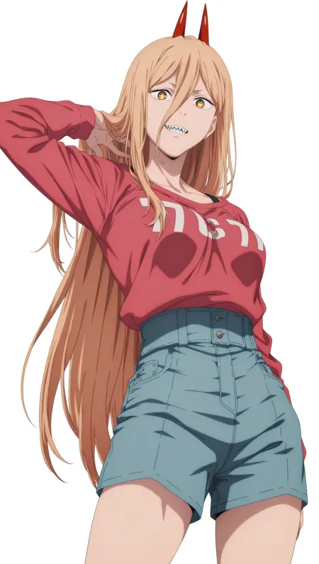 ((anime coloring)), masterpiece, best quality, amazing quality, power, 1girl, long hair, blonde hair, symbol-shaped pupils, medium breasts, horns, red horns, sweater, shorts, shirt tucked in, solo, pose, standing, looking at viewer, (((white background, simple background)))