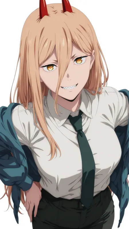 ((anime coloring)), masterpiece, best quality, amazing quality, power, 1girl, long hair, blonde hair, symbol-shaped pupils, medium breasts, horns, red horns, shirt, white shirt, collared shirt, necktie, jacket, blue jacket, pants, black pants, off shoulder, solo, pose, standing, looking at viewer, (((white background, simple background)))