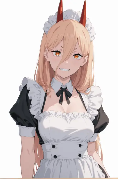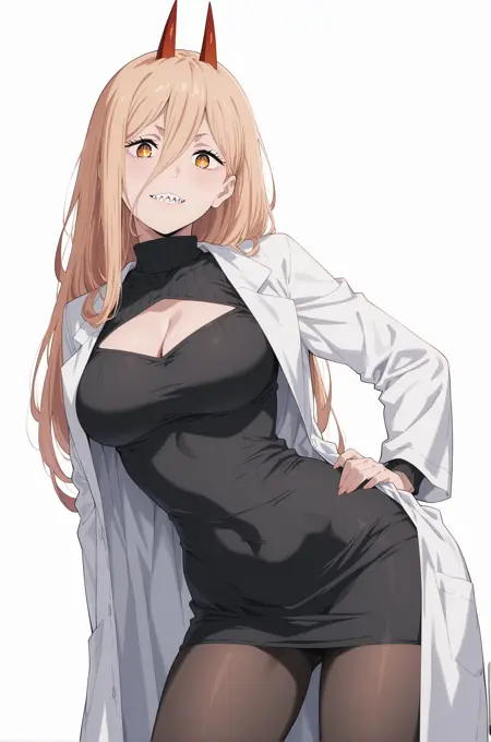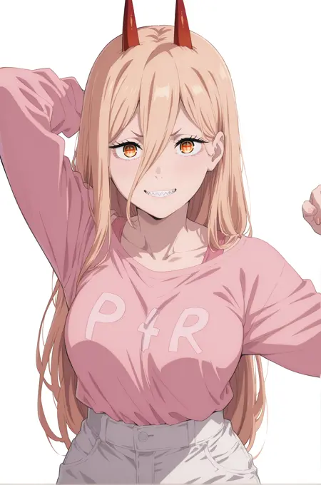 ((anime coloring)), masterpiece, best quality, amazing quality, power, 1girl, long hair, blonde hair, symbol-shaped pupils, medium breasts, horns, red horns, sharp teeth, shirt, white shirt, collared shirt, necktie, jacket, blue jacket, pants, black pants, off shoulder, solo, pose, standing, looking at viewer, (((white background, simple background)))