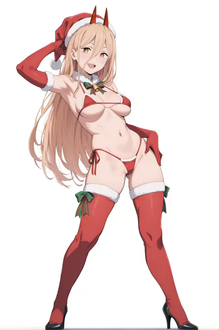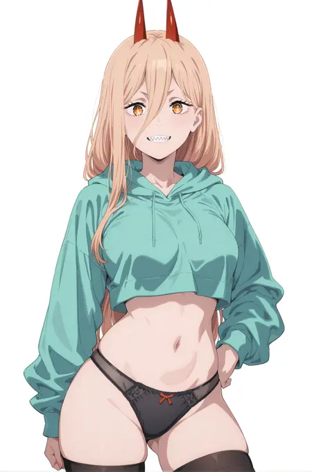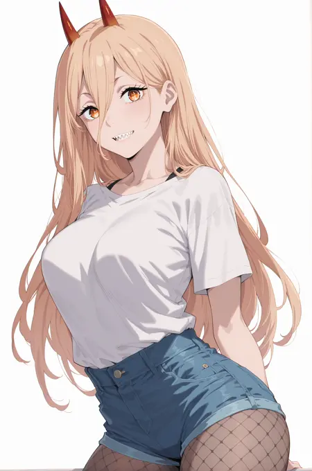 ((anime coloring)), masterpiece, best quality, amazing quality, power, 1girl, long hair, blonde hair, symbol-shaped pupils, medium breasts, horns, red horns, sweater, shorts, shirt tucked in, solo, pose, standing, looking at viewer, (((white background, simple background)))