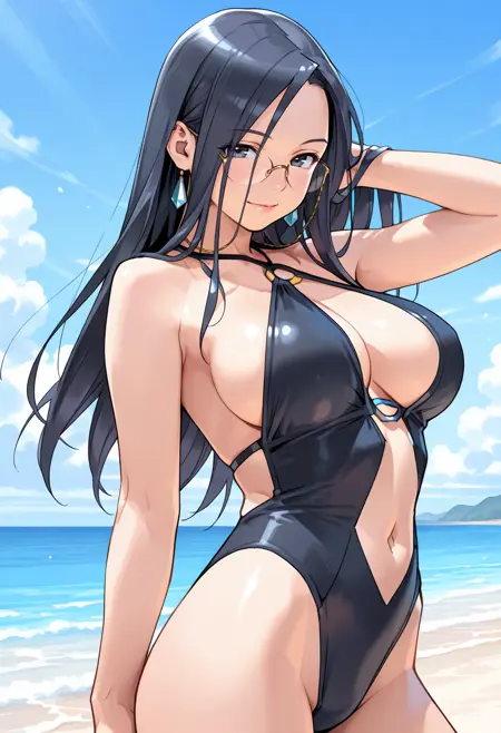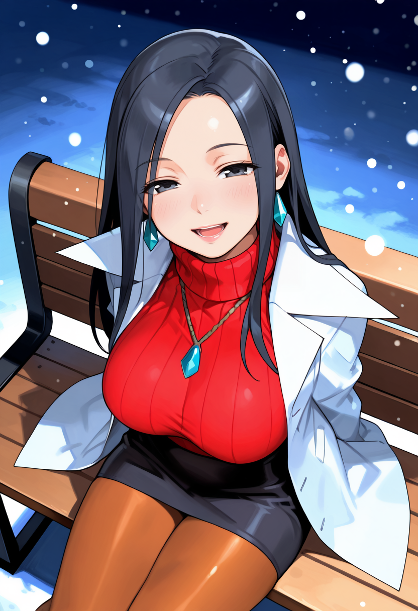 white coat, red sweater, turtleneck sweater, pendant, pencil skirt, black skirt, brown pantyhose, large breasts, black hair, long hair, glasses, eyewear strap, earrings, makeup, black eyes, lips