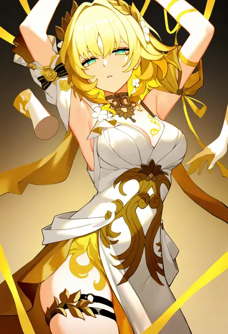 脱落的袖子,连衣裙,角斗士凉鞋,金色鞋履,希腊-罗马风格服装,发饰,高跟凉鞋,高跟鞋,珠宝,长裙,中等胸部,微张的嘴唇,凉鞋,独身,细带高跟鞋,大腿绑带,大腿,白色连衣裙,崩坏:星穹铁道,崩坏 \(系列\),