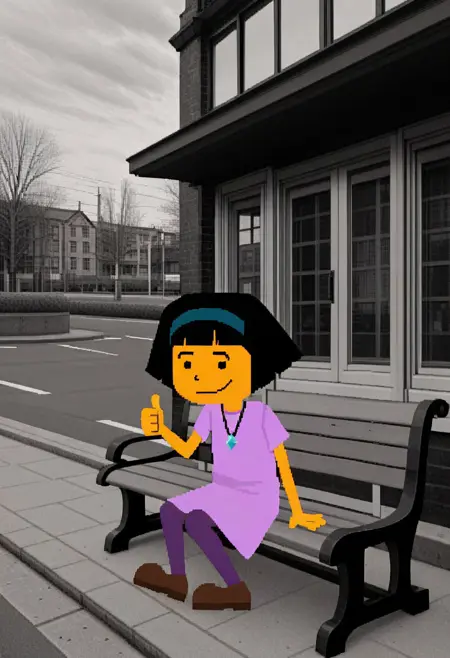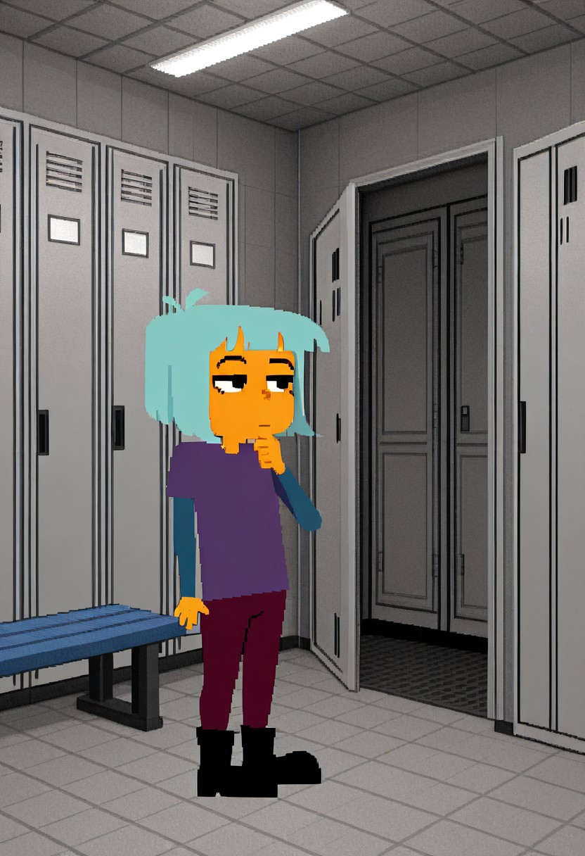 Character prompt: source_cartoon, pixel art, flat color, orange skin,dot eyes, no sclera (swap last two with “black eyes” for Dimension Q style. While orange skin is the default, some tertiary characters with “pale skin” and “dark skin” were trained, as were a few “grey skin” beings from Dimension Q)