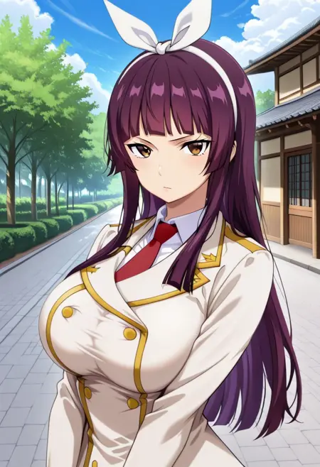 Kagura Mikazuchi, long hair, purple hair, hime cut, white hairband, white bow with a knot, brown eyes