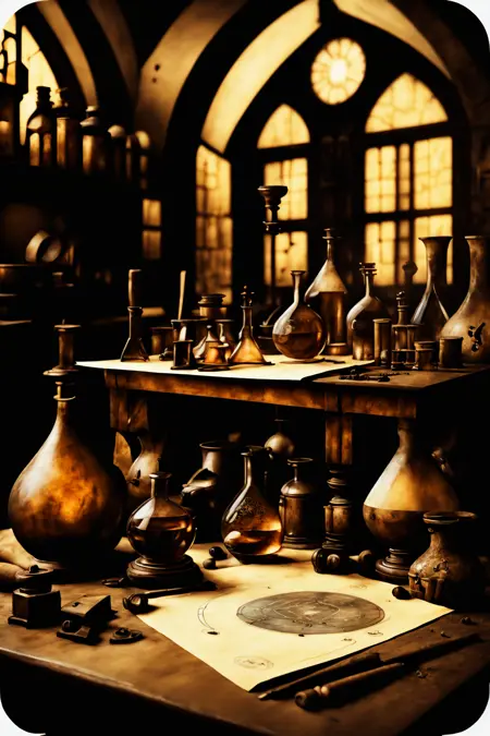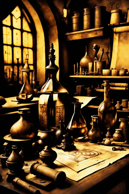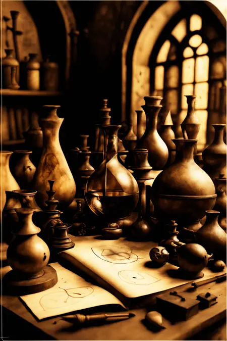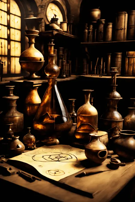 Concepts: Leonardo da Vinci's sketches, parchment scrolls, alchemical apparatus, renaissance artistry.