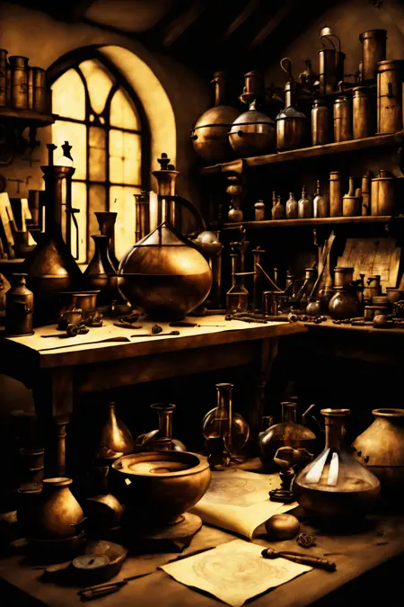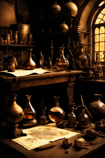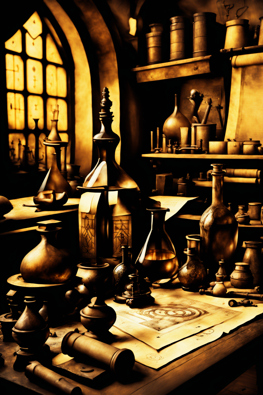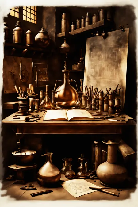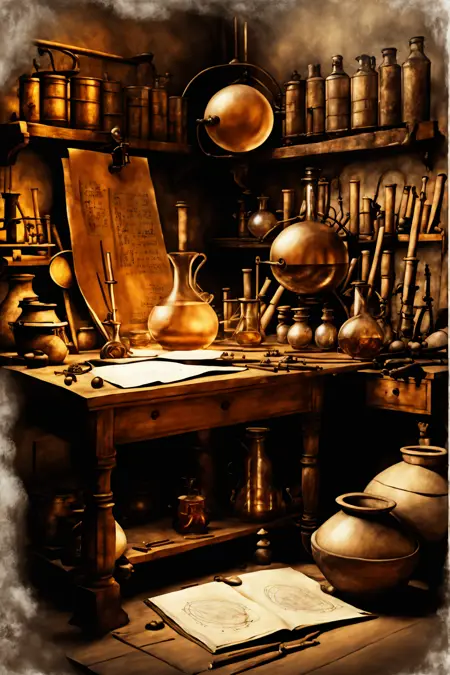 概念:列奥纳多·达·芬奇的素描、羊皮纸卷轴、炼金术装置、文艺复兴艺术。