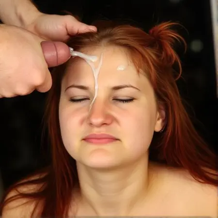 예시: FlxFcl. 중앙에는 여자의 얼굴이 있다. 그녀의 이마, 눈, 그리고 얼굴 한쪽에는 흰색 반투명한 점액이 묻어 있다. 그녀의 눈은 닫혀 있고 입도 닫혀 있다. 그녀의 머리는 이미지 오른쪽으로 약간 기울어져 있다. 그녀는 혐오스러운 표정을 짓고 있다. 배경에는 검은 소파가 있다. 오른쪽에는 프레임 밖의 남자가 발기한 음경을 잡고 있으며, 음경이 여자의 이마에 닿아 있다. 남자는 여자의 머리카락을 잡고 있다. 그의 팔에는 문신이 있다. 남자는 다리를 여자의 뒤쪽에 두고 발은 소파 위에 올려 놓았다. 그는 검은 양말을 신고 있다. lora:flux-facial:1