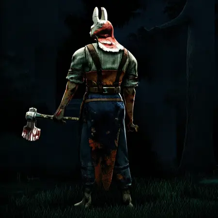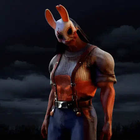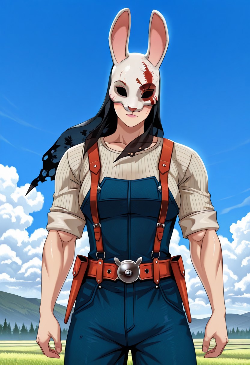 main_outfit, rabbit_mask, rabbit_ears, white shirt, black transparent scarf, blue_overalls