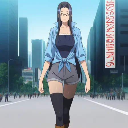 カジュアル:グレーのショートパンツ、黒タンクトップ、青シャツ、結んだシャツ、黒丈長靴下、絶対領域、ブーツ、メガネ