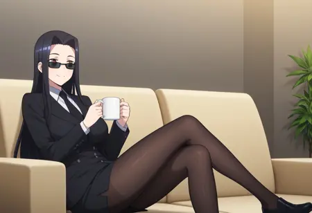 スーツ:スーツ、黒スーツ、黒ジャケット、黒スカート、白シャツ、黒ネクタイ、パンティーホース、黒靴