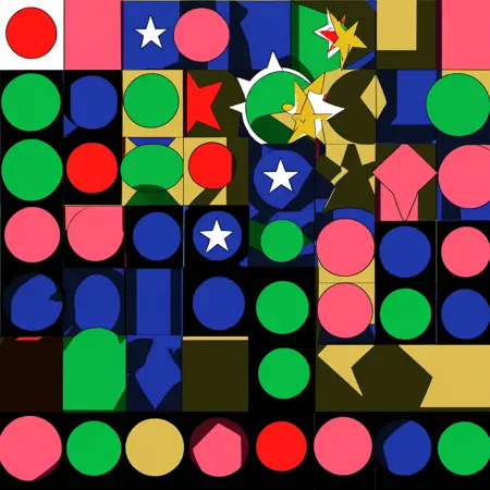 A 2d icon that fits within a grid., A singular 2d icon meant to fill an icon placement within a larger grid with strange shapes., A 2d chaotic icon of random shapes., A singular 2d icon with chaotic shapes with a black border.