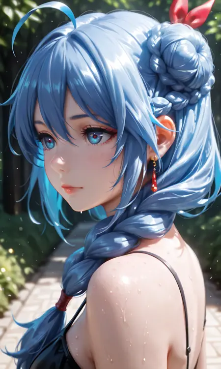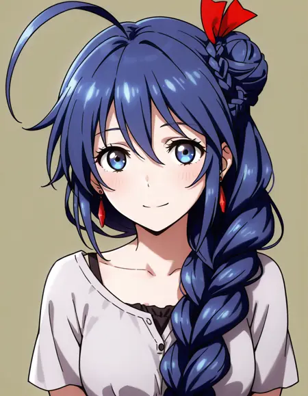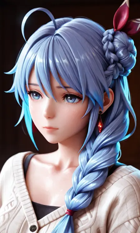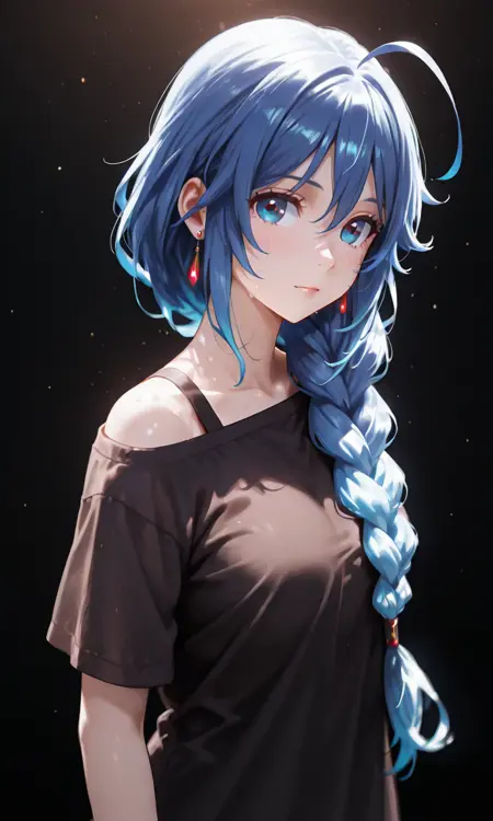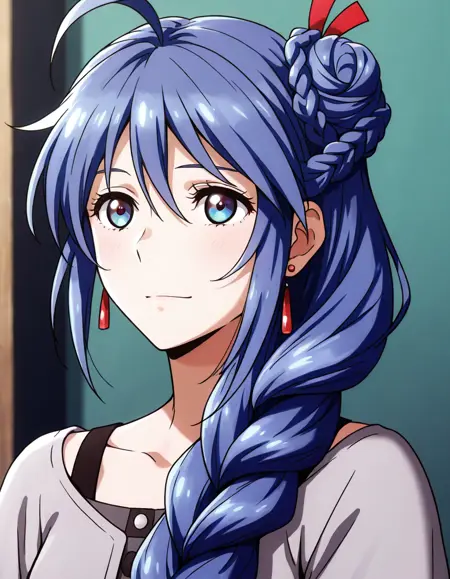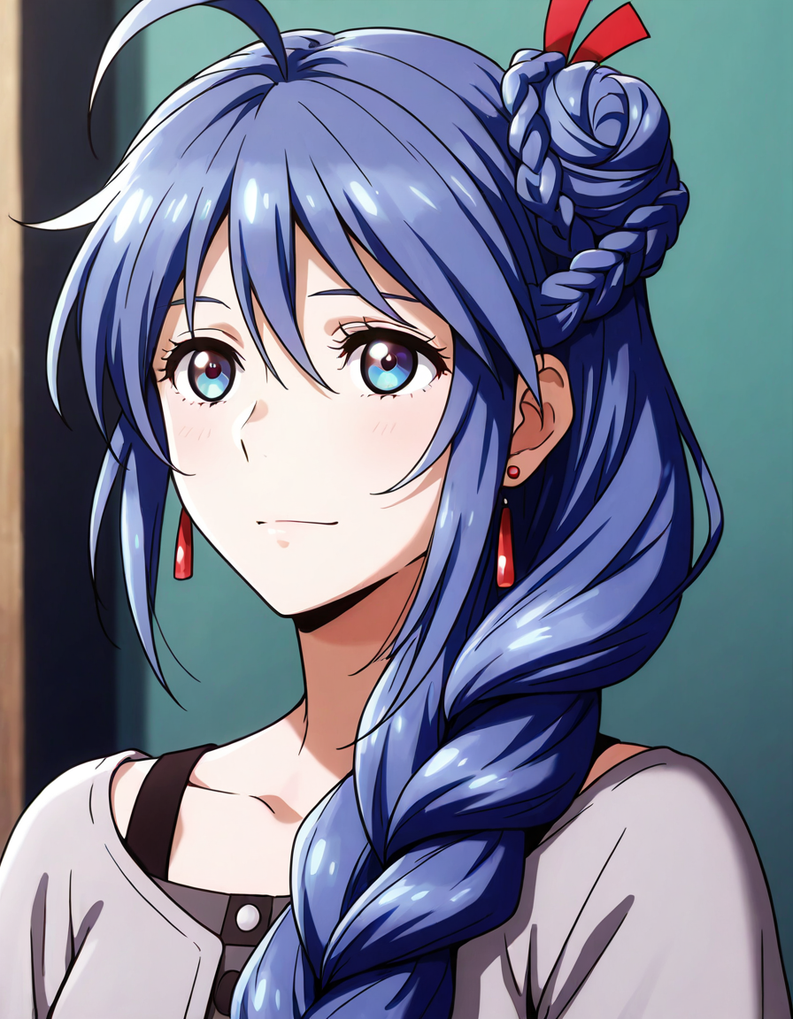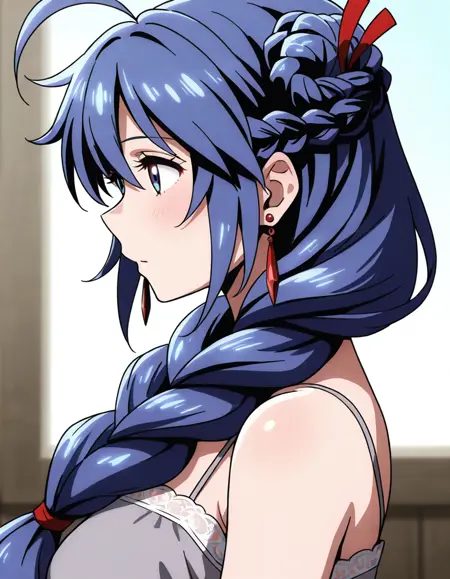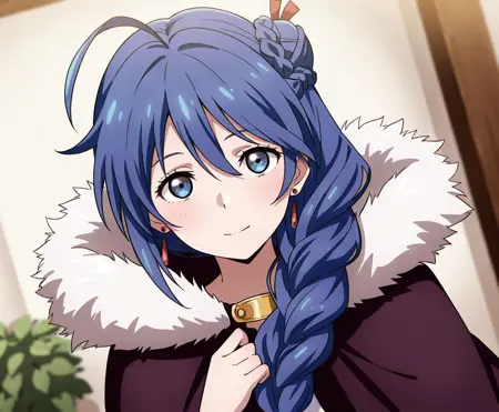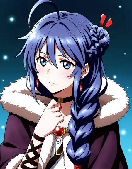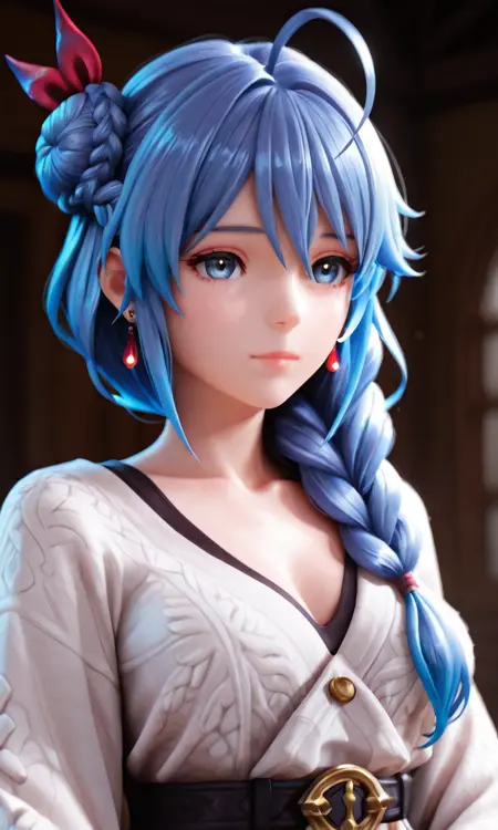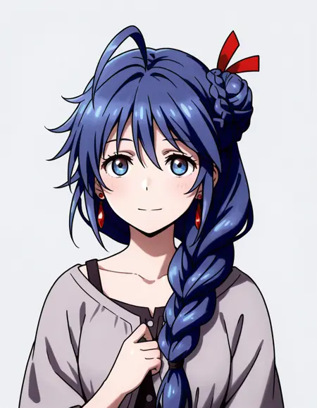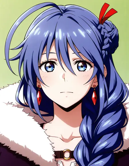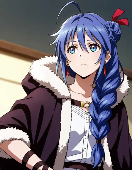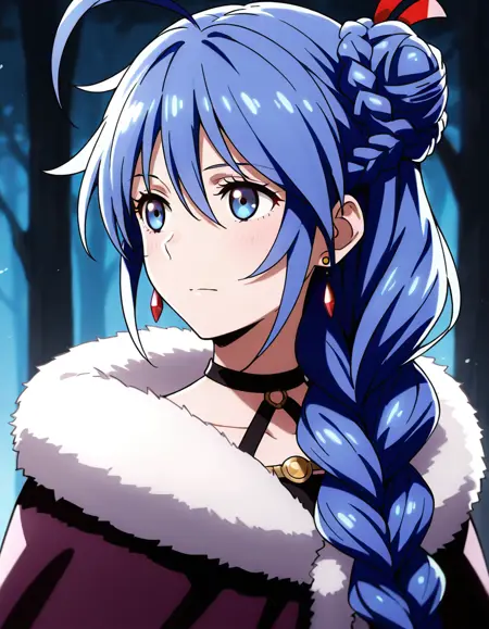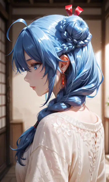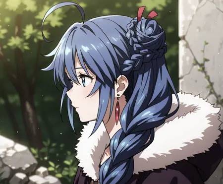 1girl,solo,blue eyes,blue hair,long hair,bangs,hair ornament,hair ribbon,hair between eyes,braid,single braid,hair bun,single hair bun,hair over shoulder,ahoge,earrings,hood,hood down,cloak,fur trim,grey dress,ring,