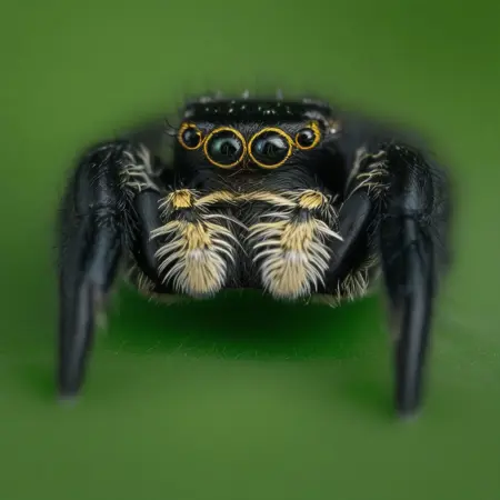 • 흑색과 황색의 호기심 많고 귀여운 점프 거미가 보는 사람을 바라보고 있다.