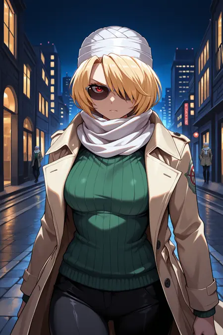 彼女の典型的な外見には "ターバン、白いマスク、ニンジャマスク、包帯、包帯を巻いた腕、タバード、濃紺のボディスーツ" を追加してください。