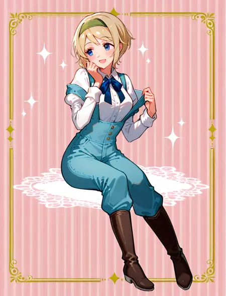 x hair ornament, green headband, white shirt, juliet sleeves, overalls, neckbow, blue pants
