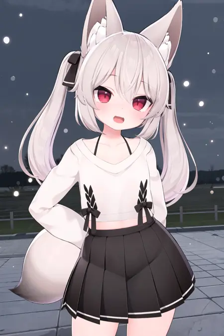 grey hair, long hair, twintails, bangs, hair between eyes, animal ears, fox ears, animal ear fluff, red eyes, tail, fox tail, virtual youtuber,
