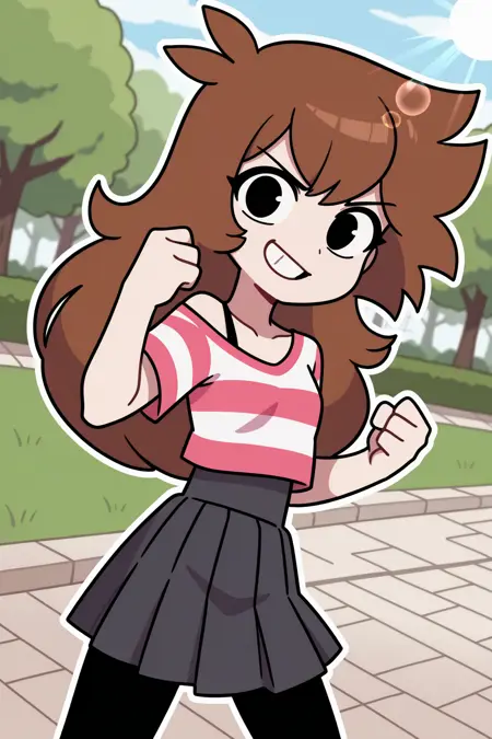 기본값: omsshgurr, 1girl, 만화, 갈색 머리, 검은 눈, 긴 머리, 앞머리, 줄무늬 셔츠, 어깨 드리운 셔츠, 브라 끈, 주름 치마, 검은 팬티스타킹,