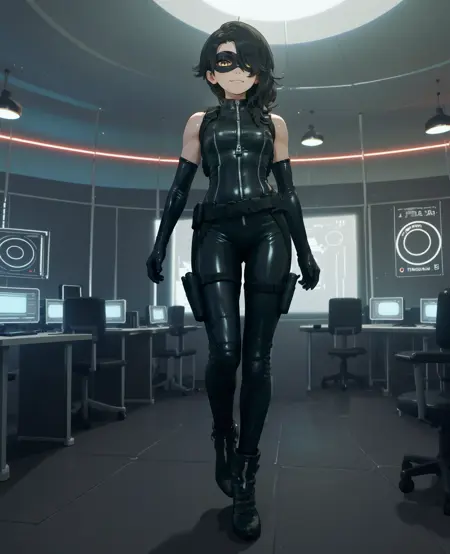 Stealth Outfit: St34lth, bodysuit, cleavage, zipper, black gloves, elbow gloves, belt, holster, domino mask, boots, heels