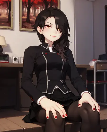 Haven Uniform: H4v3nUn1f0rm, black jacket, long sleeves, school uniform, black skirt, pantyhose, red nails