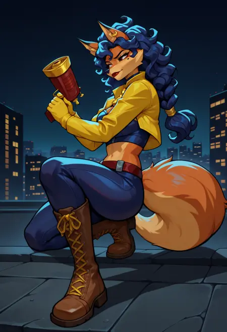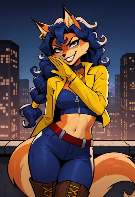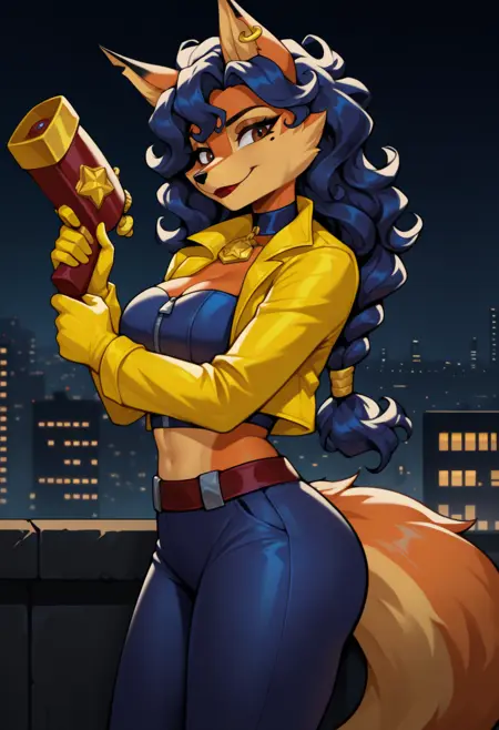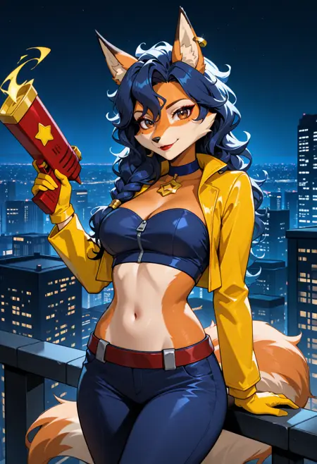 옷 태그: 한쪽 귀걸이, 금색 머리끈, 파란색 목걸이, 별 모양 목걸이, 짧은 재킷, 긴 소매, 노란색 재킷, 노란색 장갑, 파란색 밴도, 지퍼 상의, 허리, 빨간색 벨트, 파란색 바지