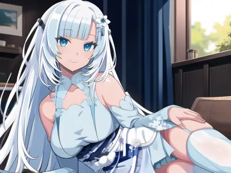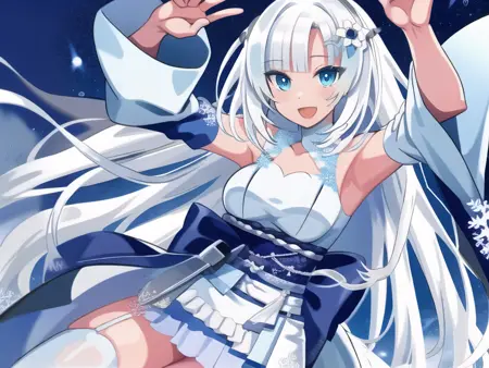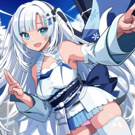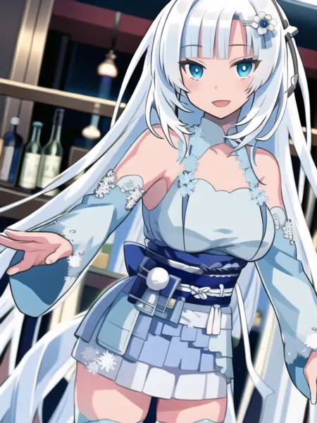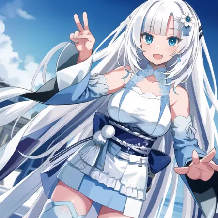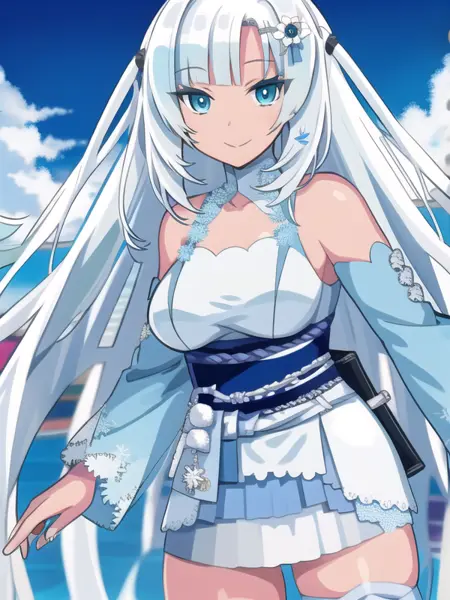 hiteCUL,sky hair,blue eyes,hair ornament,white dress,miniskirt,sleeveless,detached sleeves,obi,thigh strap,blue thighhighs,geta,