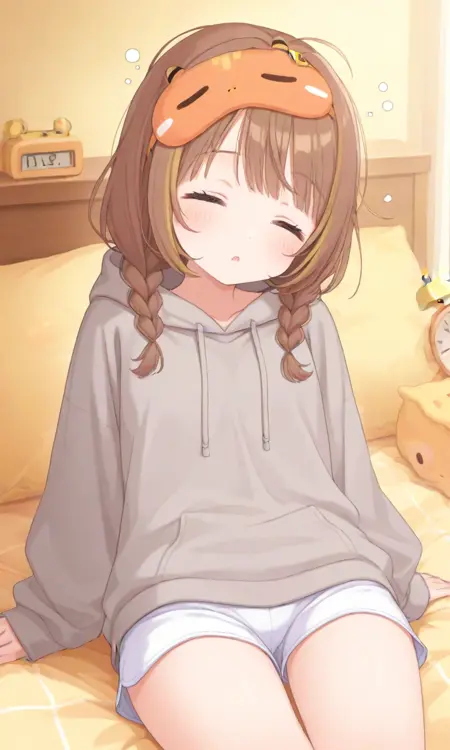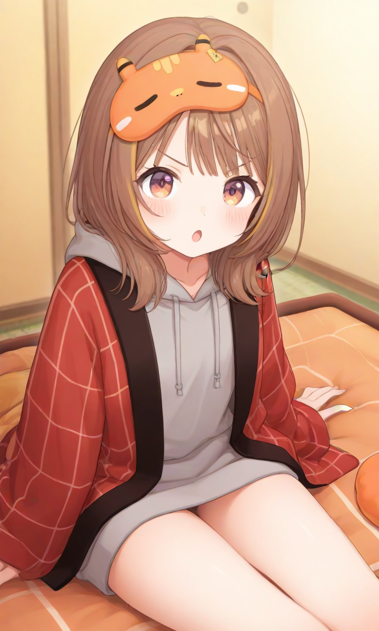 yuuhi second, medium hair, mask on head, sleep mask, hanten \(clothes\), grey hoodie, white shorts- ジャケットを削除したい場合は、