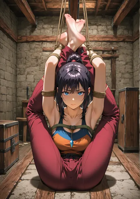 <lora:ContortionSuspendedHanging_Illustrious_v2:0.7>, contortionsuspendedhanging, 1girl, solo, breasts, nipples, nude, small breasts, pussy, feet, folded, anus, toes, arms behind back, legs behind head, bound, bdsm, bondage, rope, restrained, clitoris, shibari, bound arms, bound legs, suspension, hanging, arms up, legs up, bound wrists, look at viewer, anime, (anime colouring:1.1), good anatomy,
