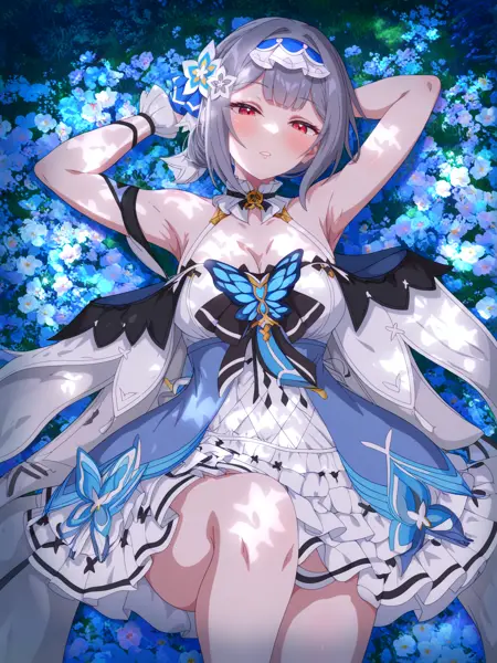byblis \(epic seven\), grey hair, short hair, bangs, red eyes, hair ornament, hair flower, hairband, frilled dress, white dress, blue dress, butterfly brooch, wrist cuffs, collar, bare shoulders, cleavage, medium breasts