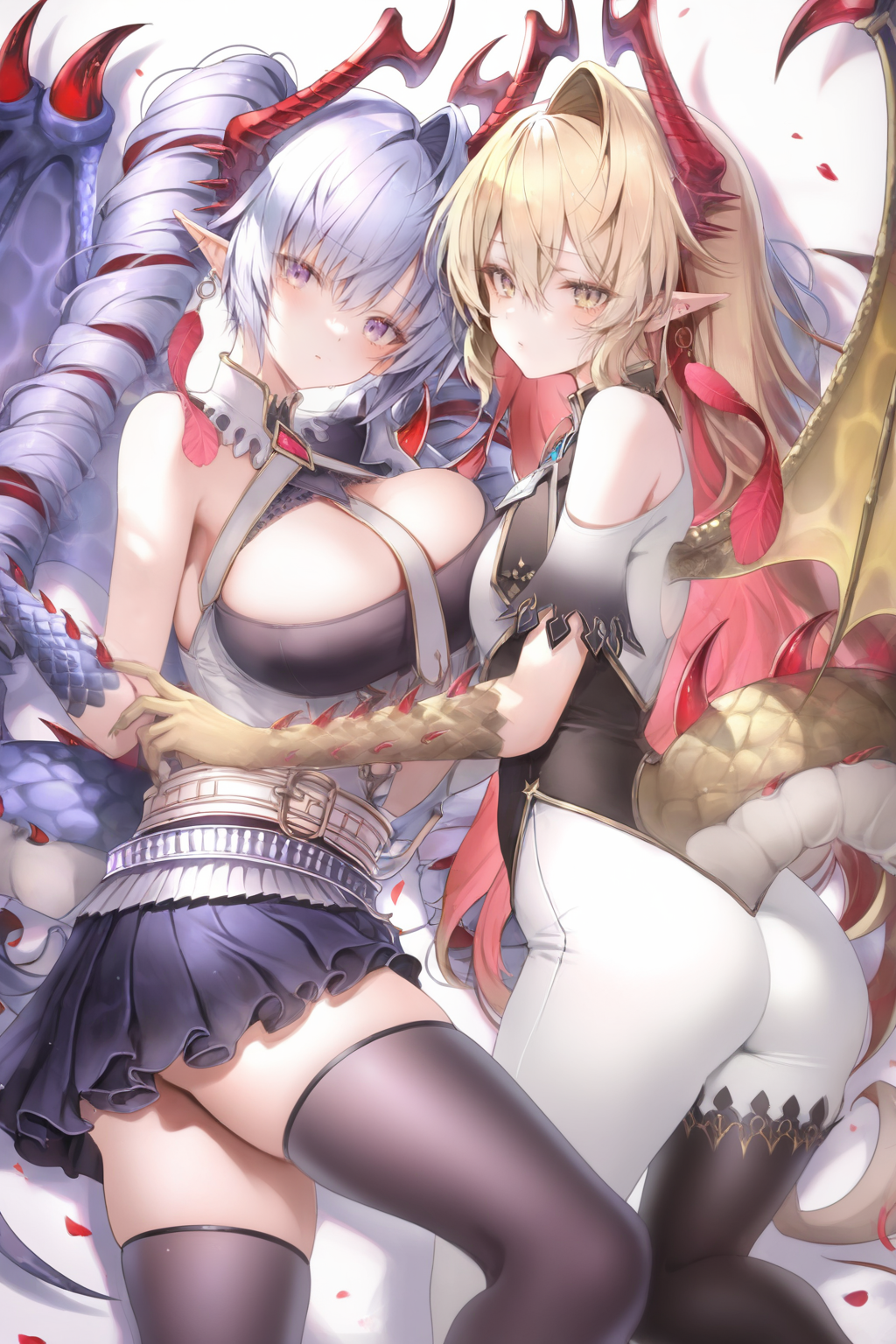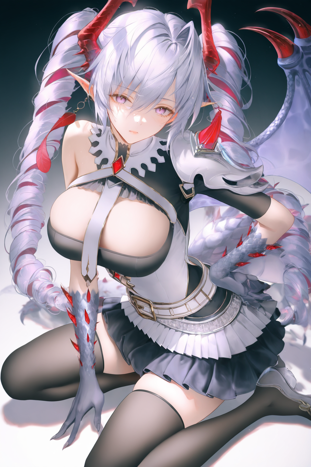 Argente :argente, horns, pointy ears, wings, long hair, dragon tail, dragon girl, black thighhighs, huge breasts, purple eyes, skirt, cleavage, twintails, drill hair, white belt, grey hair, feather earrings, armor, high heels, shoulder armor, necktie, white shirt, claws