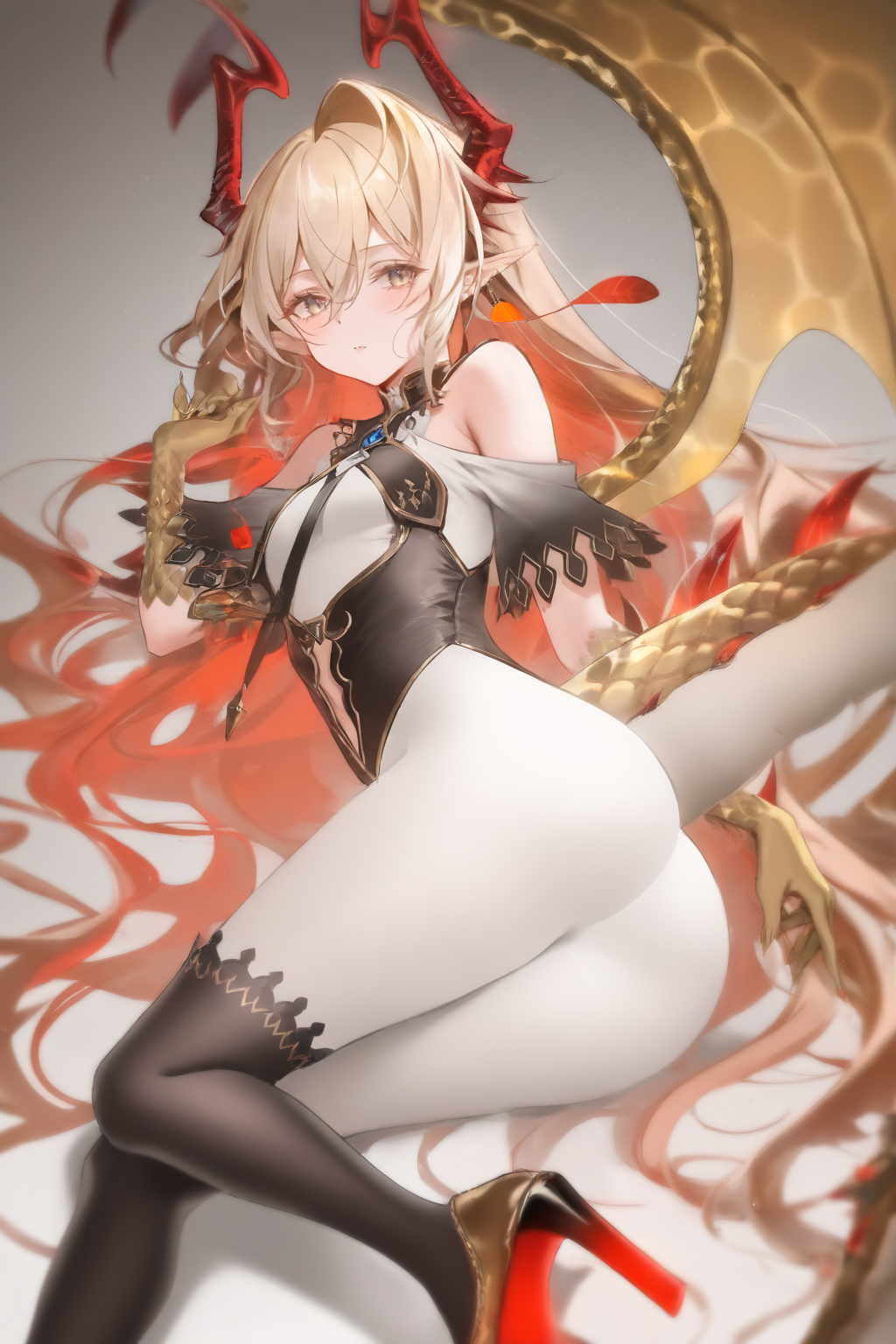 Lumiore :lumiore, tail, horns, long hair, solo, blonde hair, dragon tail, yellow eyes, black corset, dragon girl, pointy ears, feather earrings, side drill, white bodysuit, small breasts, wings, breast curtain, shoulder cutout, black thighhighs, asymmetrical legwear, red footwear, feather earrings, claws