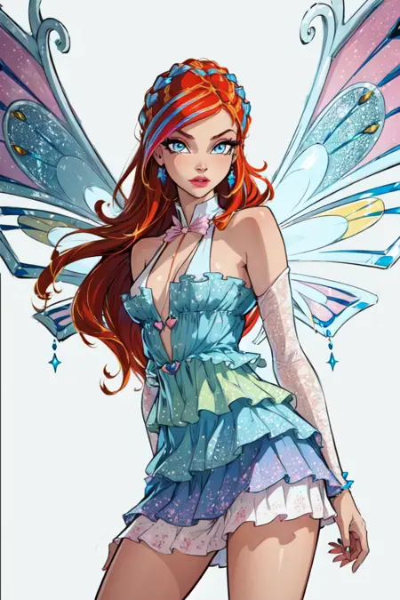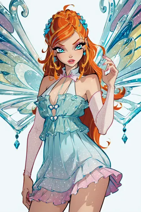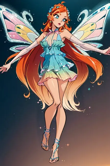 Additional: dress, fairy wings, orange hair, blue eyes, sparkling outfit