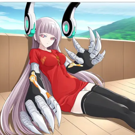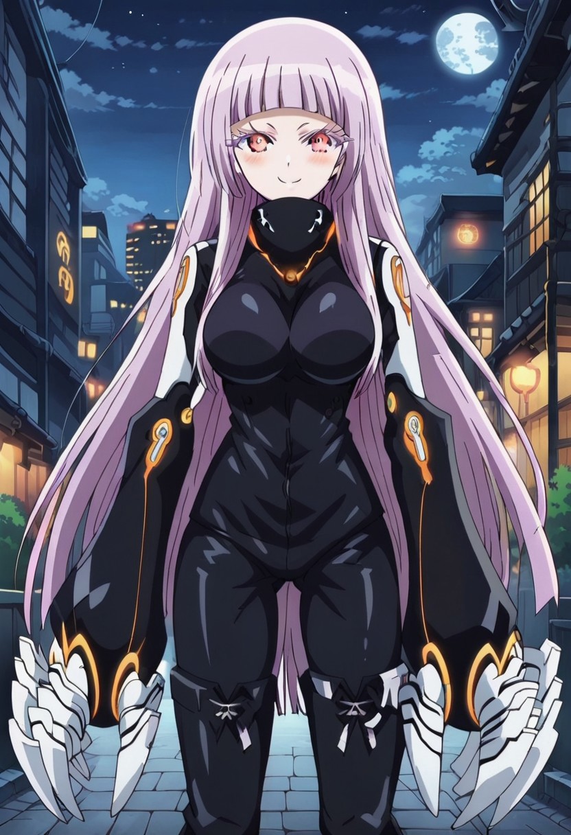 Outfit: tight black bodysuit, orange circuit patterns, oversized sleeves, mechanical claws, Black Pants, headgears, black boots