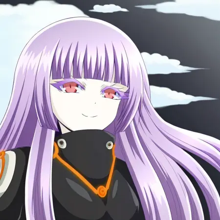 Base: cordelia kasukami, pale skin, long hair, straight purple hair, blunt bangs, pink eyes
