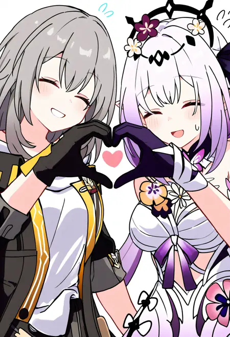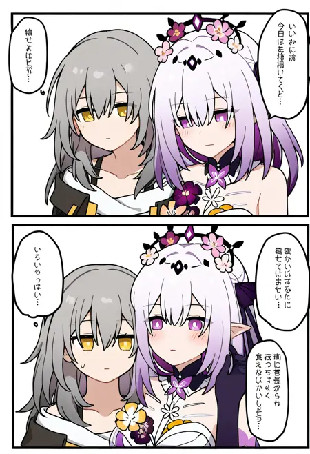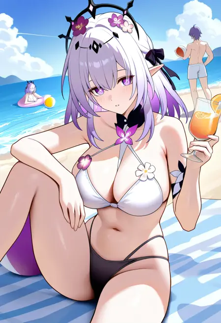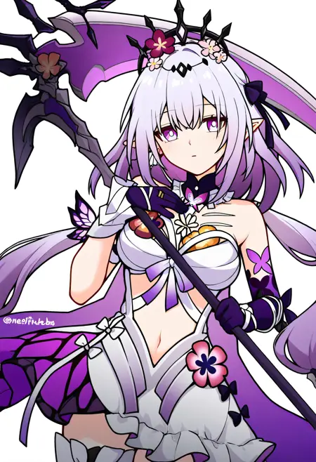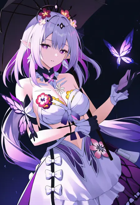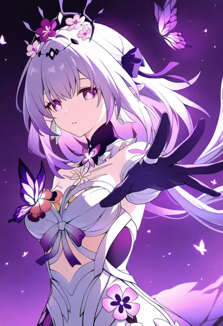 기타: 비대칭 장갑, 어깨 노출, 검은 장갑, 검은 관모, 뼈, 가슴, 드레스, 팔꿈치 장갑, 꽃, 장갑, 머리 꽃, 헤어 장신구, 시청자 바라보기, 중간 크기 가슴, 벌어진 입, 날카로운 귀, 보라색 꽃, 혼자, 척추, 관모, 비대칭 장갑, 흰 드레스, 혼카이 스타 레일, 혼카이 \(시리즈\),