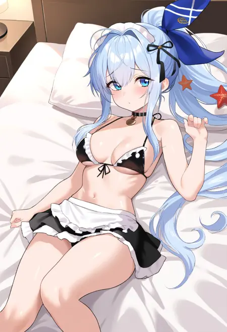 \(anchor\), anchor_\(swimsuit\), blue hair, sidelocks, long hair, ponytail, blue eyes, black choker, hair ribbon, hair ornament,