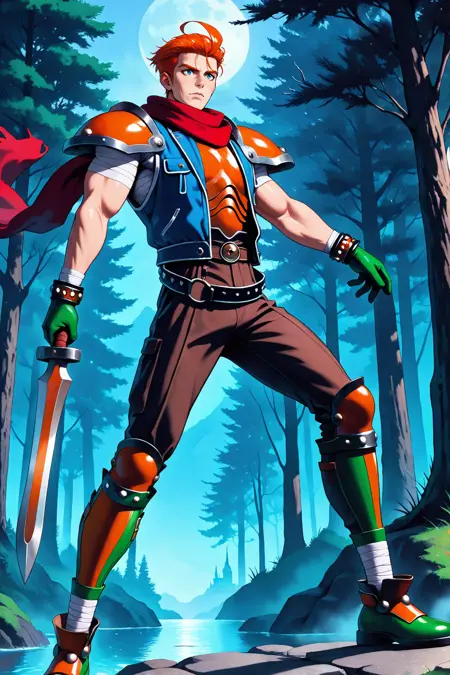 | 训练词汇 | 1boy, solo, male focus, (toned male:1.3), (muscular:0.5), mature male, adult, toned face, skinny, long legs, upward-swept hair, amber hair, blue eyes, fur lined vest, blue denim vest, open vest, orange pauldrons, copper breastplate, studded bracelets, green gloves, studded belt, brown pants, green greaves, bandaged ankles, big ahoge, simple background, red scarf, white bandages, bandaged sleeves, short sleeves, bandaged wrists,已复制! |