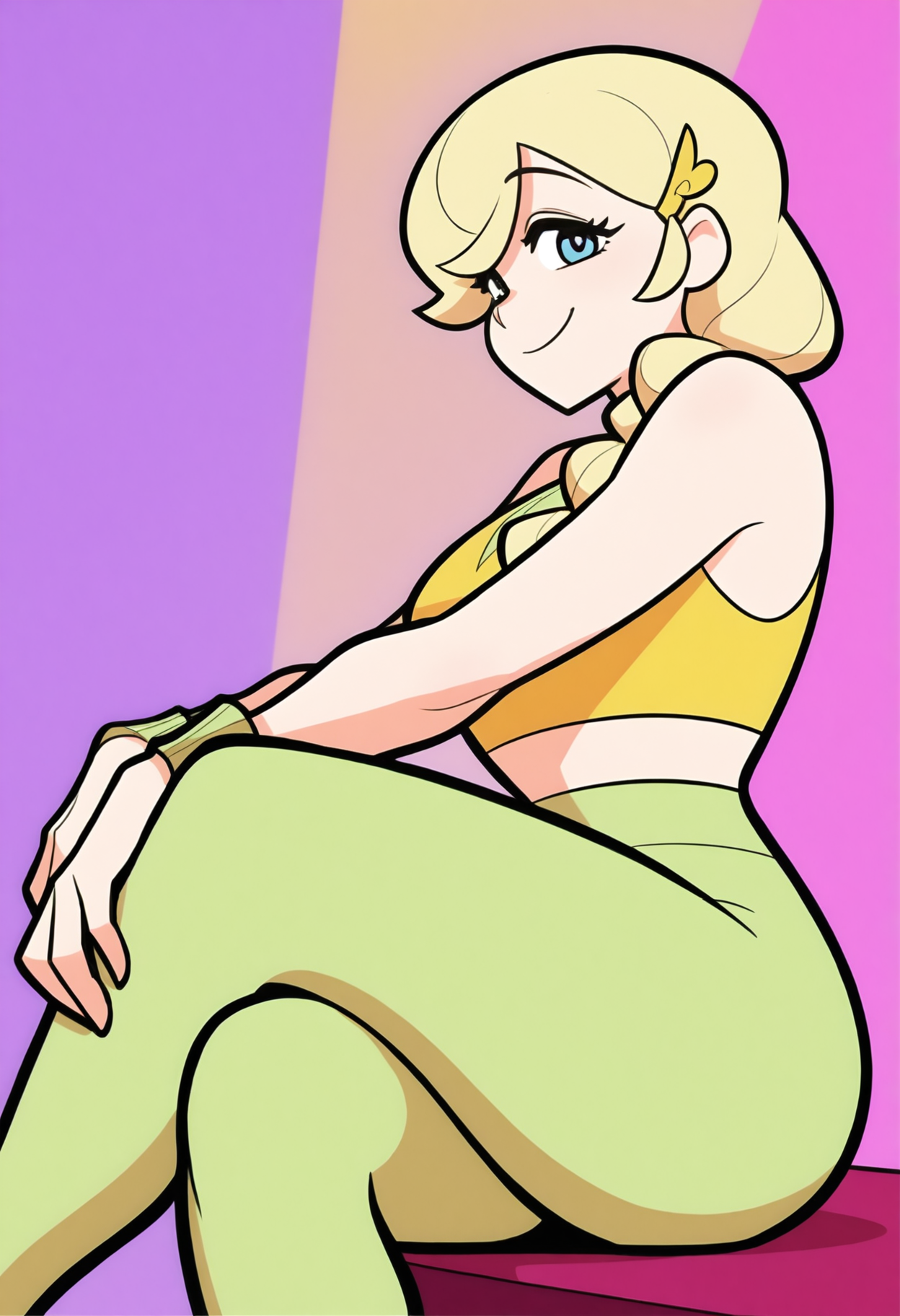 d0v333, blonde hair, braid, blue eyes, hair ornament, bare shoulders, yellow sports bra, crop top, green wristband, light green leggings,