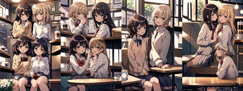 All samples in this example are output at 600x900 and have HighRes.Fix 1.5 applied. This was added just in case, as the angle of view changes when merging to strengthen the background, causing characters to appear smaller. The LCM output is 7 steps. Using a sampler with a higher number of steps may improve the appearance of fingers, etc. However, using an excessive number of steps will have the opposite effect.