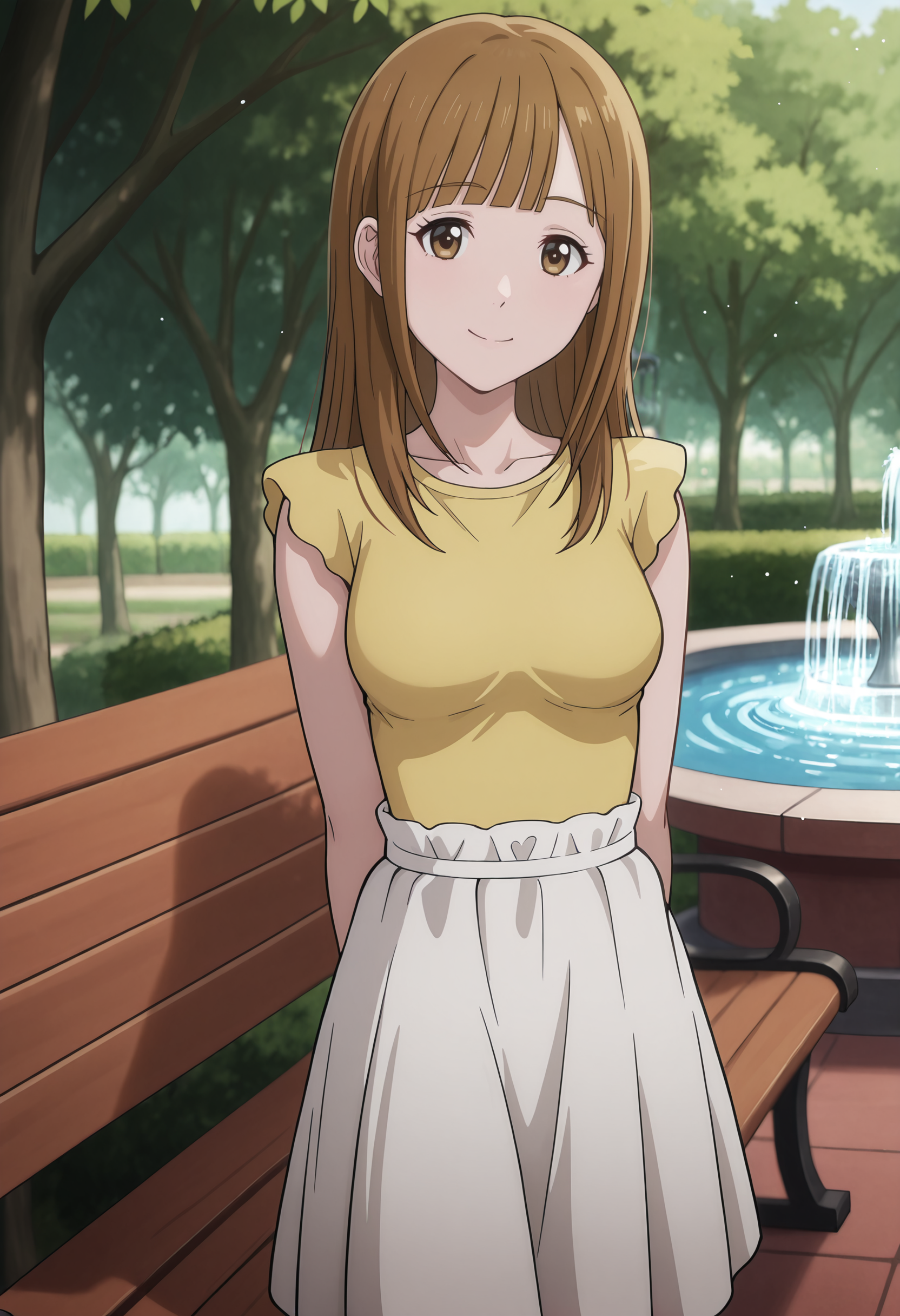 #1: 노란색 민소매 셔츠, 흰색 치마, 노란색 펌프스
