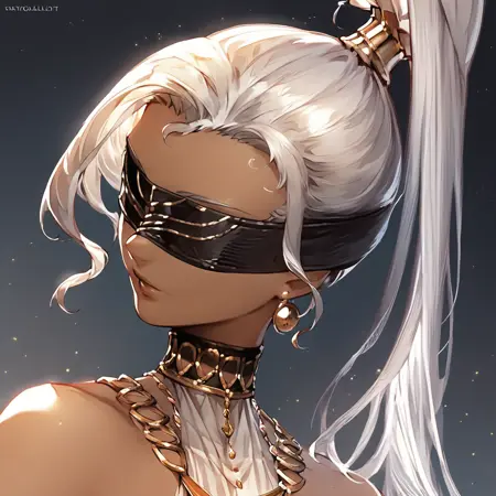 触发词: 哈斯纳、深色皮肤、深色皮肤女性、眼罩、白发、长发、马尾、高马尾、耳环、珠宝、舞者、项圈、项链、裸露肩膀、连衣裙、暴露服装、透视、臂环、黑色肘套、脱落袖子、乳房、侧乳、肚脐、腹部、骨盆帘、大腿饰,