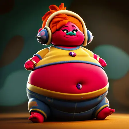 DJ 수키, 트롤, 분홍색 피부, 주황색 머리, 허리, 헤드폰, 싱글, 보석, 맨발, 팔찌, 두더지, 미소, 색상이 있는 피부, 배꼽 보석