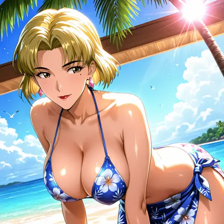 Trigger : Ritsuko, 1girl, blonde hair, mole under eye, labcoat, earrings, jewelry, short hair, belt, lipstick, makeup