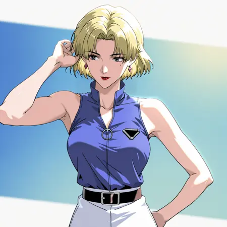 Trigger with blue shirt: RitsukoBlueShirt, 1girl, blonde hair, mole under eye, earrings, jewelry, short hair, shirt, sleeveless, bare shoulders, belt, lipstick, makeup, cowboy shot