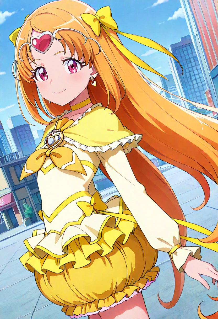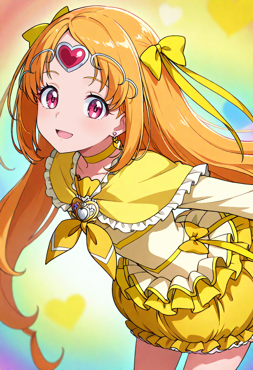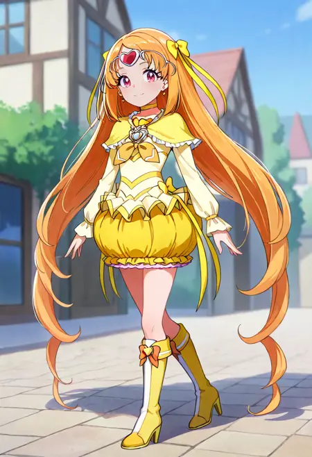 cure muse \(yellow\), orange hair, brown hair, very long hair, twintails, shiny hair, pink eyes, red eyes, purple eyes, eyebrows visible through hair, eyelashes, hair ribbon, hair bow, yellow ribbon, yellow bow, circlet, tiara, heart hair ornament, heart earrings, yellow dress, capelet, long sleeves, yellow choker, yellow neckwear, brooch, bubble skirt, yellow skirt, layered skirt, frilled skirt, high heels, knee boots, yellow footwear