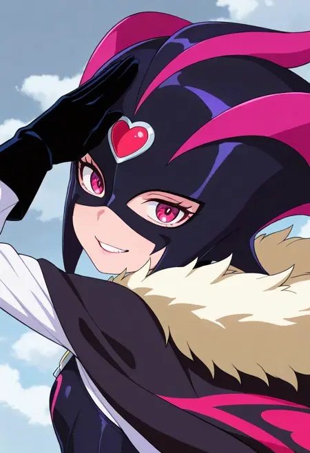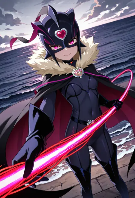 crmsblack, mask, helmet, forehead jewel, heart jewelry, red eyes, eyelashes, black cape, black bodysuit, long sleeves, white sleeves, brooch, fur trim, fur collar, fur-trimmed cape, black gloves, black pants, belt, black legwear, black footwear, skin tight, thigh boots, knee boots
