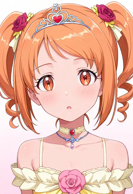 cure muse \(yellow\), orange hair, brown hair, very long hair, twintails, shiny hair, pink eyes, red eyes, purple eyes, eyebrows visible through hair, eyelashes, hair ribbon, hair bow, yellow ribbon, yellow bow, circlet, tiara, heart hair ornament, heart earrings전신